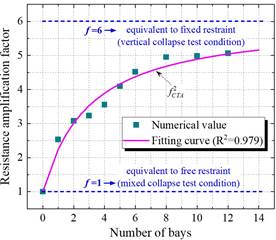 相邻跨数对双边约束框架倒塌抗力的影响 悬链线受力阶段峰值抗力放大系数拟合
