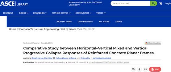 近日,研究成果以《钢筋混凝土平面框架水平-竖向混合和竖向连续倒塌响应的对比研究》(Comparative Study between Horizontal-Vertical Mixed and Vertical Progressive Collapse Responses of Reinforced Concrete Planar Frames)为题,发表在美国土木工程师协会(American Society of Civil Engineers, ASCE)创办的权威期刊《结构工程期刊》(Journal of Structural Engineering)上。该期刊创刊于1983年,是结构工程领域最古老和被认可度最高的期刊之一,近3年年均发文量仅272篇。人居学院侯健教授为论文通讯作者,博士生刘秉峰为论文第一作者,西安交通大学是该论文的第一作者单位和唯一通讯作者单位,该研究工作获得了国家自然科学基金面上项目和陕西省重点研发计划项目的共同资助。